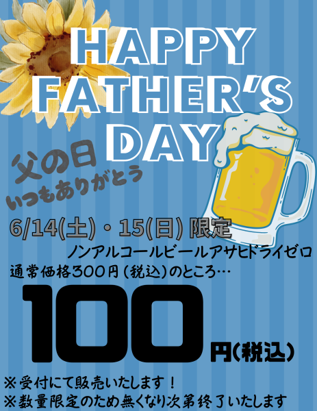 毎日頑張っているお父さんに日頃の感謝の気持ちを込めて、6/14(土)・15(日)の2日間限定でノンアルコール缶ビール通常価格300円(税込)をなんと!100円(税込)で販売いたします!!!